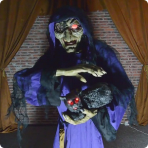 There is a strange Halloween old lady Halloween witch which is petting her cat.